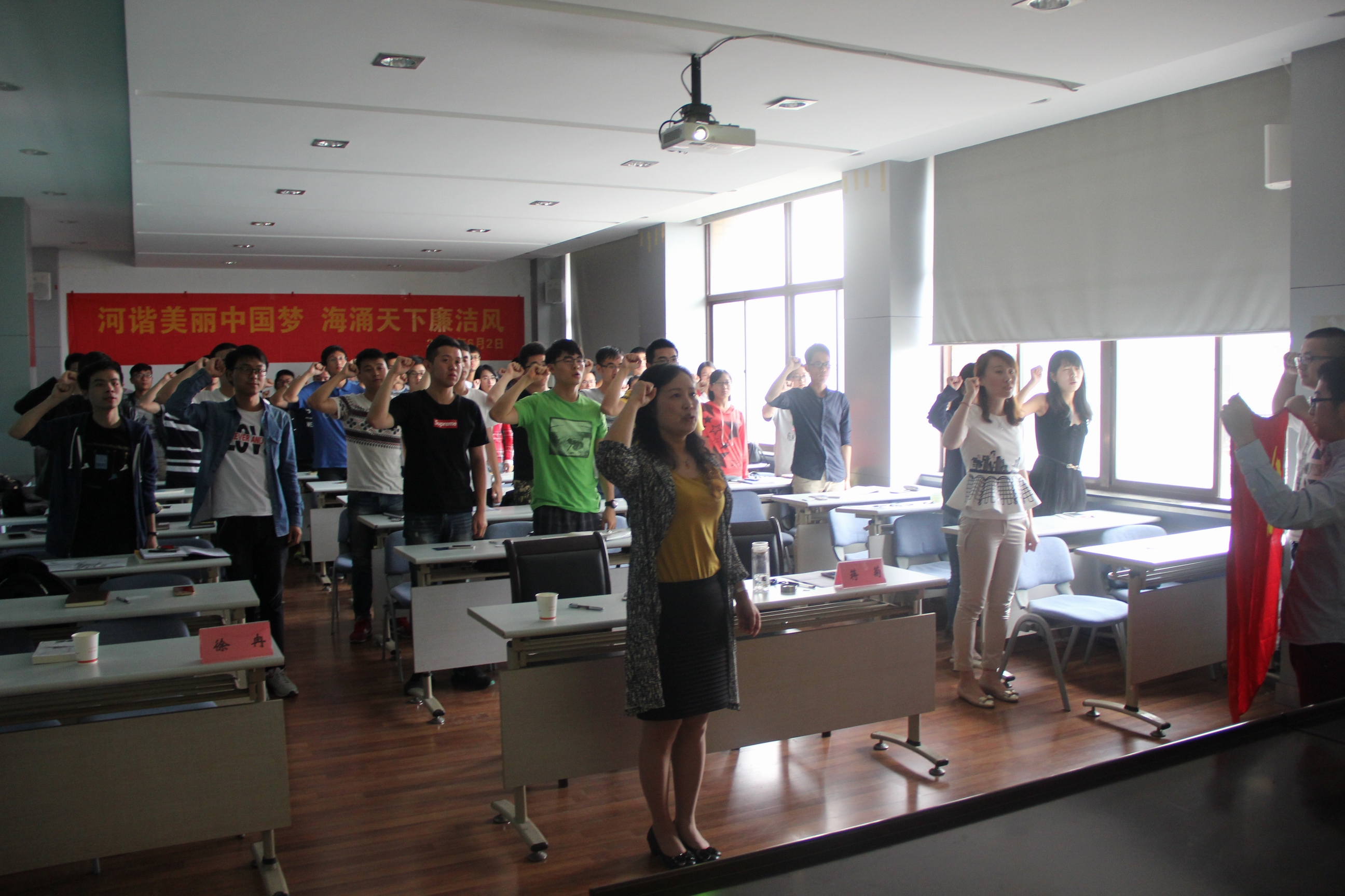 蒋菊副书记以《让青春在党旗下飞扬——与毕业班党员共勉》为题,为2016届毕业班党员上了一堂生动的党课。她结合自己在英国访学时的经历和大家分享了自己的感受,图文并茂,生动有趣。要求党员同志们要坚定信念不动摇,优良传统不能丢,责任使命不推卸。为了巩固认识,统一思想,时刻牢记党的教诲,蒋书记带领大家一起重温了入党誓词。