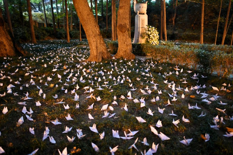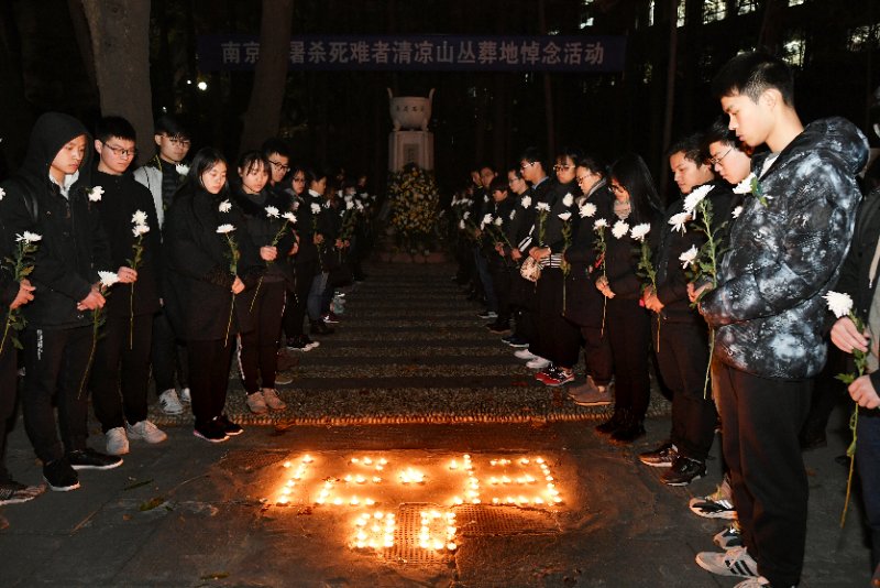同学们在纪念碑前用蜡烛摆上了“12.13”和“80”的字样。5点30分,潘静书记与吴昊书记带领两个班级全体同学来到纪念碑前,大家身着黑色服装,胸前佩戴鲜花,手捧鲜花与蜡烛,围绕“12.13”、“80”的蜡烛字样站立,低头默哀,用蜡烛寄托对大屠杀死难同胞的哀思,用鲜花表达对不甘屈辱奋起反抗的斗士的敬重。默哀结束后,大家有序绕行纪念碑一圈,献上手里的鲜花,部分同学手持亲手折叠的纸鹤,表达了对南京大屠杀死难者的祈福以及对世界和平的美好祝愿。