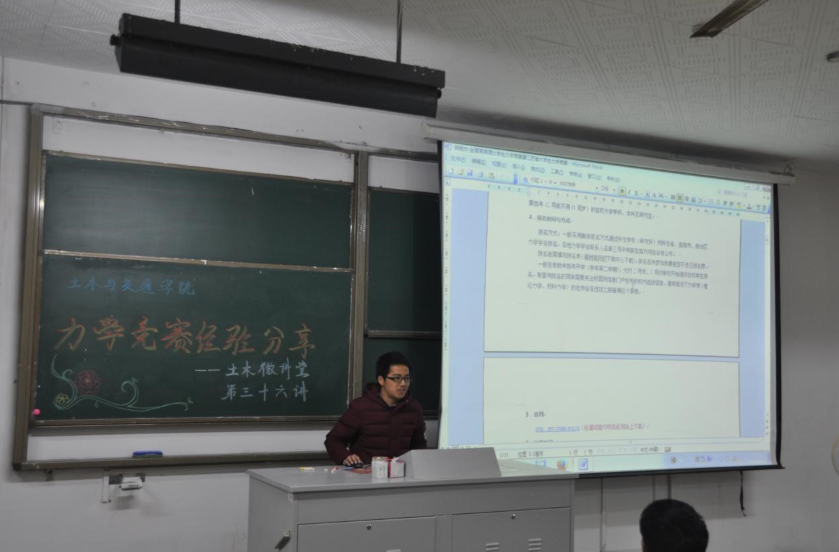 2017年2月22日18点30分,土木与交通学院土木微讲堂第三十六讲之“全国周培源大学生力学竞赛参赛经验分享”在我校西康路校区北教101成功举办。本次微讲堂邀请到了12级土木工程优秀本科生胡艳杰以及13级土木工程优秀本科生江洋两位同学作为主讲人,为同学们分享他们参加周培源大学生力学竞赛的经验。